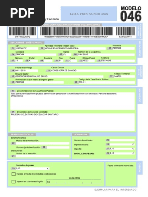 No obstante despus de efectuar el pago tendr que pasar por la secretara del centro para una copia del impreso pagado. Puede imprimir desde casa el modelo 046 descargndolo a travs de Internet. Tasas precios pblicos sanciones y otros ingresos El presente modelo 046 es el documento genrico para efectuar pagos a la Junta de Comunidades de Castilla-La Mancha de las tasas precios pblicos y otros ingresos de naturaleza pblica o de caracter patrimonial que no tengan documento de pago especfico.
